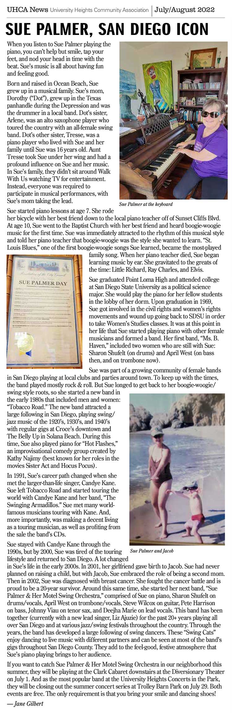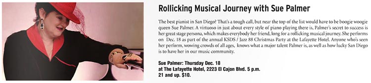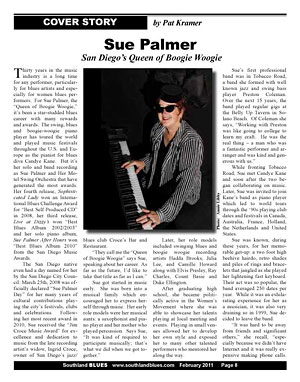 "If you've been around San Diego a while, you've seen Sue Palmer. Banging on her piano with the vigor and liveliness of a little boy on a toy xylophone, she plays jump boogie like no one's business. Unlike some of the newer aficionados of the style who treat the music like some sort of lodestone, Palmer knows her music for what it is: a friend to be embraced, enjoyed, and occasionally knock about a little bit."