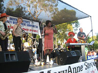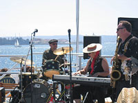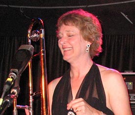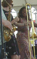 "Sue Palmer was leader and wonderful boogiewoogie pianist who seemed to put the room into motion. I didn't see anyone not moving to the music. April West's outstanding trombone playing left me speechless, especially when she removed her right shoe and played it with her foot for one tune! Drummer Sharon Shufelt drove the band and vocalist Deejha Marie captured the audience with her first note and didn't turn them loose until the set ended. This San Diego based band with vocalist was one of the highlights of this festival, and a must see feature."