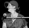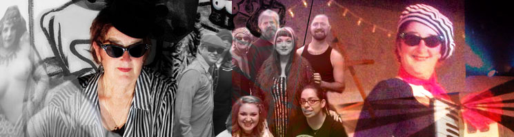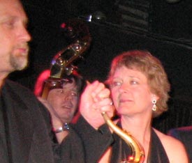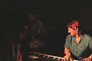 That something so complex and so unique could take place in a tiny alcohol-free, smoke-free dive known as Dizzy's should, I suppose, come as no surprise. Palmer and Dizzy's proprietor Chuck Perrin, who wrote and performed some of the work's "noir" narrative, packed them in, folks diverse of race, age, and gender preference. The Diva herself, Sue Palmer, presided at the piano, her voice mute except for an occasional, subtle vocal backup and for one wild piercing scream. From a strictly theatrical standpoint, Palmer is like a one-woman mime-troupe, an engaging, slyly clownish presence. Others thrown into the film noir narrative soup provided vocals as well. Bass-baritone David Mosby oozed hot sex, blues singer Deejha Marie provided bluesy sauce, and outstanding song stylist Romy Kaye, a touch of sass and class. Whether scat or tight harmony, the two women together were a steamroller, a scream-evoking cacophony of pleasure. Add Mosby, as Palmer does in the climactic number, and hair levitates from heads. Palmer's Motel Swing Orchestra boasts the talents of Sharon Shufelt on drums, Oliver Shirley on bass, April West on trombone, Jonny Viau on sax and bongos, and Steve Wilcox on guitar. Each , individually, is an incomparable artist. West's trombone wah-wahing, body movements and mesh stockings were a treat in and of themselves. She is personality plus...