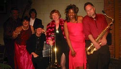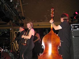 "As usual, things were hopping on Halloween in downtown San Diego. Parking was a bear but we found a lot with a single remaining spot, parked our car, and followed costumed merrymakers making their way towards the music, booming from the Gaslamp District. But we weren't going there. Turning down a side street next to the new ball park we found the dim lights of Dizzy's and walked inside. We entered a tropical scene: Tiki heads, palm thatch, hula girls and costumed dancers bouncing to the sound of Sue Palmer&Her Motel Swing Orchestra. The event marked the release of Sue's most recent CD, "Live at Dizzy's," and the crowd was clearly enjoying itself. The band was joined by musical friends and collaborators. Everyone was having a swinging good time moving through the repertoire of standards and Palmer originals including, of course,many of the tunes on the new CD. The grand finale ("Deejha's Boogie") was a driving fantastic trip that blew everyone away."