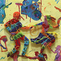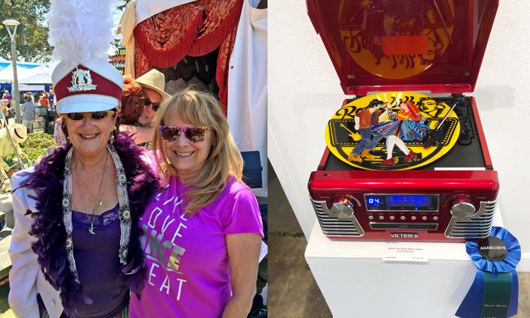 Leslie Perlis, glass artist extraordinaire, won 1st place in this Art Show in Spanish Village in September, 2019!! She made a juke box, with yours truly in the first audio slot, and a pair of glass swing dancers. She also gave me this Point Loma High School marching band hat!! We are both Pointers. Love these multi media collaborations!!