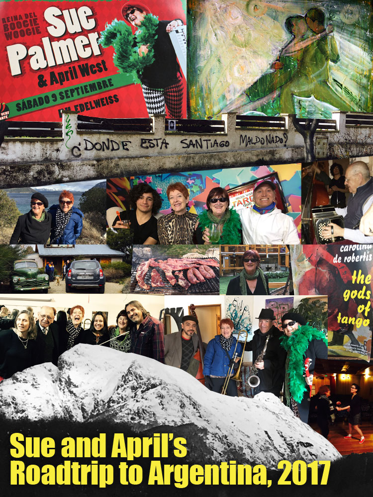 "If pressed, Sue Palmer could hold her own with some of music's greatest when dropping the names of green rooms in which she's bided her time. From posh Parisian dressing rooms stocked with caviar and champagene to lackluster lounges in Duluth, Minn., it is from these backstage areas she has emerged to whip crowds into submission with her sultry piano stylings. As a longtime musical colllaborator of blues diva Candye Kane, Palmer has traveled throughout Europe and the world with her beehive harido, outrageous outfits and trademark, left-hand boogie-woogie blues. On her fourth solo recording, the San Diego Music Awards-winner finds herself back "In The Green Room," albeit in a retro, personal sort of way. Paying homage to both family tradition and her musical roots, Palmer's new CD includes an impromptu jam session recorded in her Talmadge home. A video of the living room session is included as an enhanced track on "In The Green Room." The low-fi video includes inveterate Palmer collaborators such as trombonist April West, drummer Sharon Shufelt, guitarist Steve Wilcox and vocalist Deejha Marie. Alongside them are Palmer's mother, Dot Palmer, strumming a ukelele, and longtime friend Chris Kehoe, known more for her tenure as State senator from San Diego than as the next Chrissie Hynde..... (Highlights include) "Killer Tiki Boogie," a sort of Peter Gun meets psychedelic B-movie mind-trip, a complete departure from Palmer's trademark sound. Lending his deep, bass chops to the tune is vocalist David Mosby. Candye Kane goes wild on backing vocals,while Scott Paulson uses a Theramin to infuse the piece with science-fiction flair (Paulson is known to many as curator of toy pianos at UCSD's Gisel Library). "Gertrude&Steins" is an infectiously campy homage to bawdy women, beer, creativity and good friends. Kane croons the salacious tune, which garnered (songwriter Janell) Rock a 2004 "Just Plain Folks" award in the Best Cabaret category......