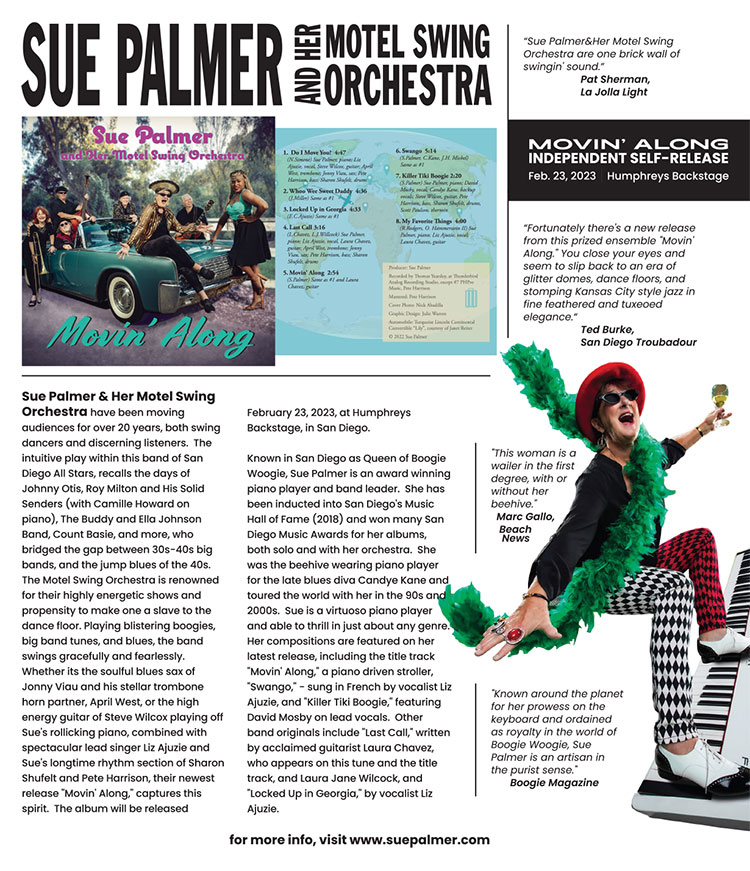 Sue will highlight her entire Motel Swing Orchestra with guest vocalists, Sharifah Muhammad and Laura Jane Willcock at her upcoming ‘Gems: Volume 2' release party January 7, 2020 at Tio Leos, 5302 Napa St. San Diego. More info is as close as www.suepalmer.com